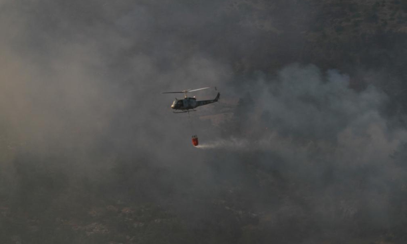 A helicopter douses wildfires in a forest in Akkar, northern Lebanon, on July 30, 2021. Lebanon battled rapidly spreading wildfires for the third day Friday in northern areas. Photo:Xinhua