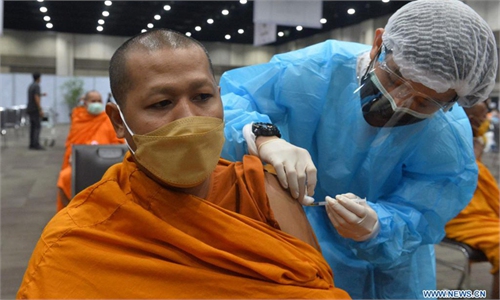 People wait before receiving doses of Sinovac's COVID-19 vaccine at the Narathiwat Hospital compound in the southern province of Narathiwat on Thursday. Thailand reported more than 20,000 new cases on Thursday, making the total infections up to 672,000. Photo: AFP