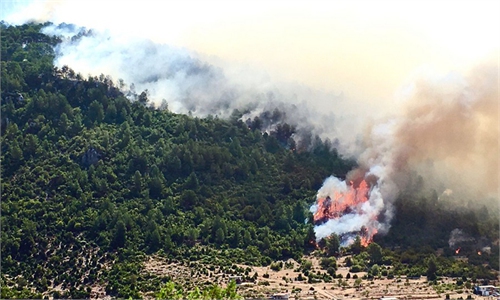 A man pushes a bicycle along a road in the vicinity of a forest fire close to the Kemerkoy Thermal Power Plant in northern Turkey on Wednesday. Photo: AFP