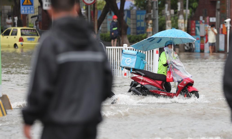 A delivery man wades through a waterlogged road on a motorcycle in Jimei District of Xiamen, southeast China's Fujian Province, Aug. 5, 2021. Typhoon Lupit made its second landfall on Thursday in Fujian Province, bringing heavy downpours and forcing the evacuation of thousands. The local government has initiated an emergency response to flood and waterlogging amid torrential rains brought by Lupit.Photo:Xinhua