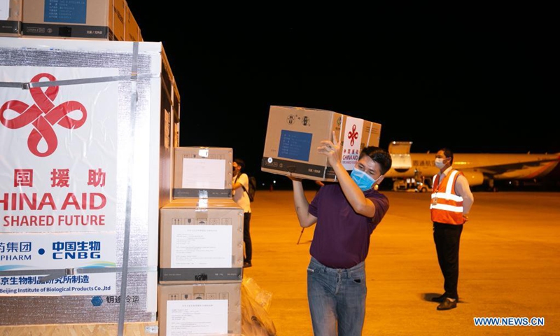 A batch of China-donated Sinopharm COVID-19 vaccines arrives at Wattay International Airport in Vientiane, Laos, Aug. 7, 2021. The fifth batch of China-donated Sinopharm COVID-19 vaccine carried by the Chinese YTO Airlines cargo plane arrived at the Lao capital Vientiane late on Saturday. Lao Health Minister Bounfeng Phoummalaysith and Economic and Commercial Counselor of Chinese Embassy in Laos Zhao Wenyu received the donation at the airport. (Photo by Kaikeo Saiyasane/Xinhua)