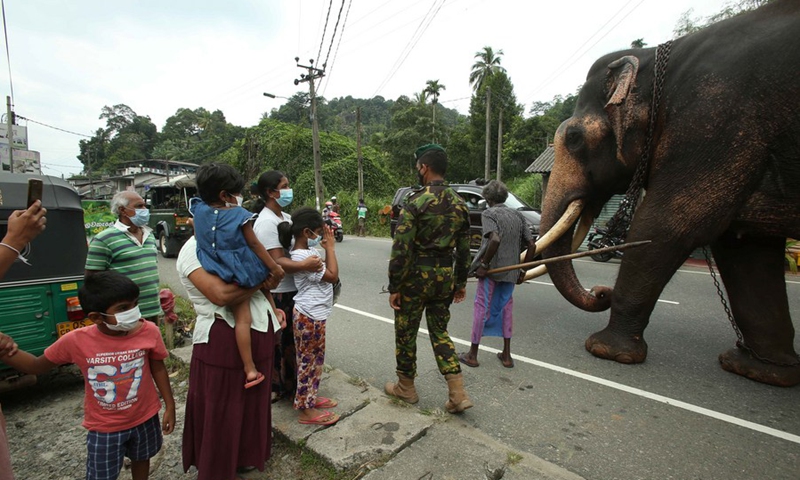 A royal elephant is seen passing Kadugannawa, a town nearby Kandy, Sri Lanka, on Aug. 11, 2021 to take part in the Kandy Esala Perahera.(Photo: Xinhua)