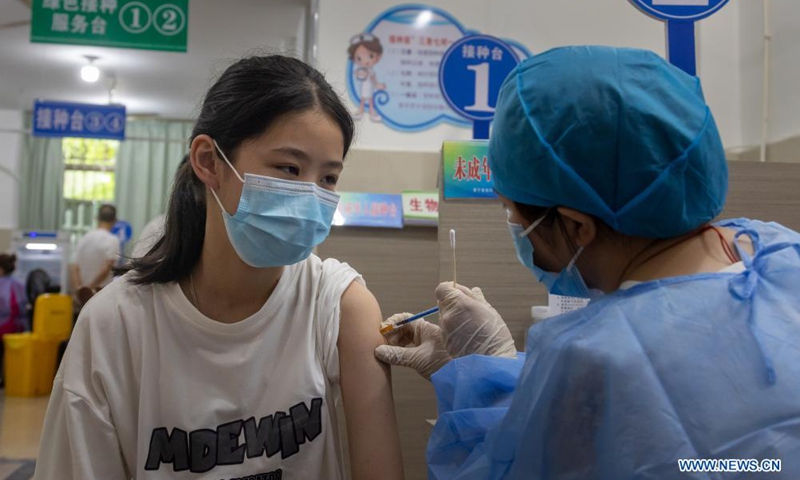 A girl receives a dose of COVID-19 vaccine at a vaccination point in Jingning She Autonomous County in Lishui, east China's Zhejiang Province, Aug. 12, 2021. China is orderly propelling its vaccination program among minors aged between 12 and 17, on the premise of ensuring safety.Photo:Xinhua