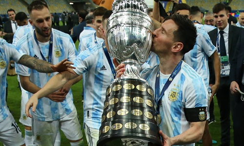 Lionel Messi waves at fans from the balcony of a hotel in Paris on Tuesday. Photo: VCG