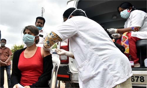 A health worker inoculates a man (center) with the dose of Covishield vaccine against COVID-19 at a vaccination center on the outskirts of Hyderabad, India on Tuesday. India has reported 32.2 million infections as of Tuesday, with about 432,000 deaths. Photo: AFP