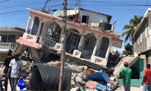 People remove debris after an earthquake, in Les Cayes, Haiti, on Aug. 15, 2021.(Photo: Xinhua)
