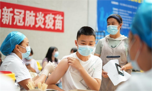 A student receives a dose of COVID-19 vaccine at a vaccination point in Danzhai County, southwest China's Guizhou Province, Aug. 12, 2021. China is orderly propelling its vaccination program among minors aged between 12 and 17, on the premise of ensuring safety.Photo:Xinhua