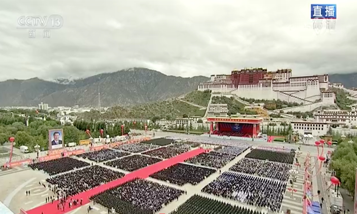 When the celebration meeting was held at the square in front of the Potala Palace, tens of thousands of people participated, including representatives of local residents, students, military and police officers. The green hills in the background were decorated with a large slogan, reading "Long live the motherland."