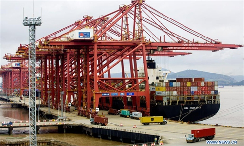 Photo taken on Aug. 15, 2021 shows a view of the Ningbo-Zhoushan Port in Ningbo, east China's Zhejiang Province. The Ningbo-Zhoushan Port saw its container throughput reach 20 million TEUs (Twenty-foot Equivalent Units) on Sunday, one month earlier than last year.(Photo: Xinhua)