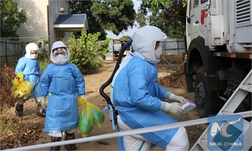 Medical workers disinfect the coffin of a deceased unconfirmed Ebola patient inside an Ebola Treatment Centre run by the Alliance for International Medical Action (ALIMA), in Beni on August 13, 2018. Photo: VCG