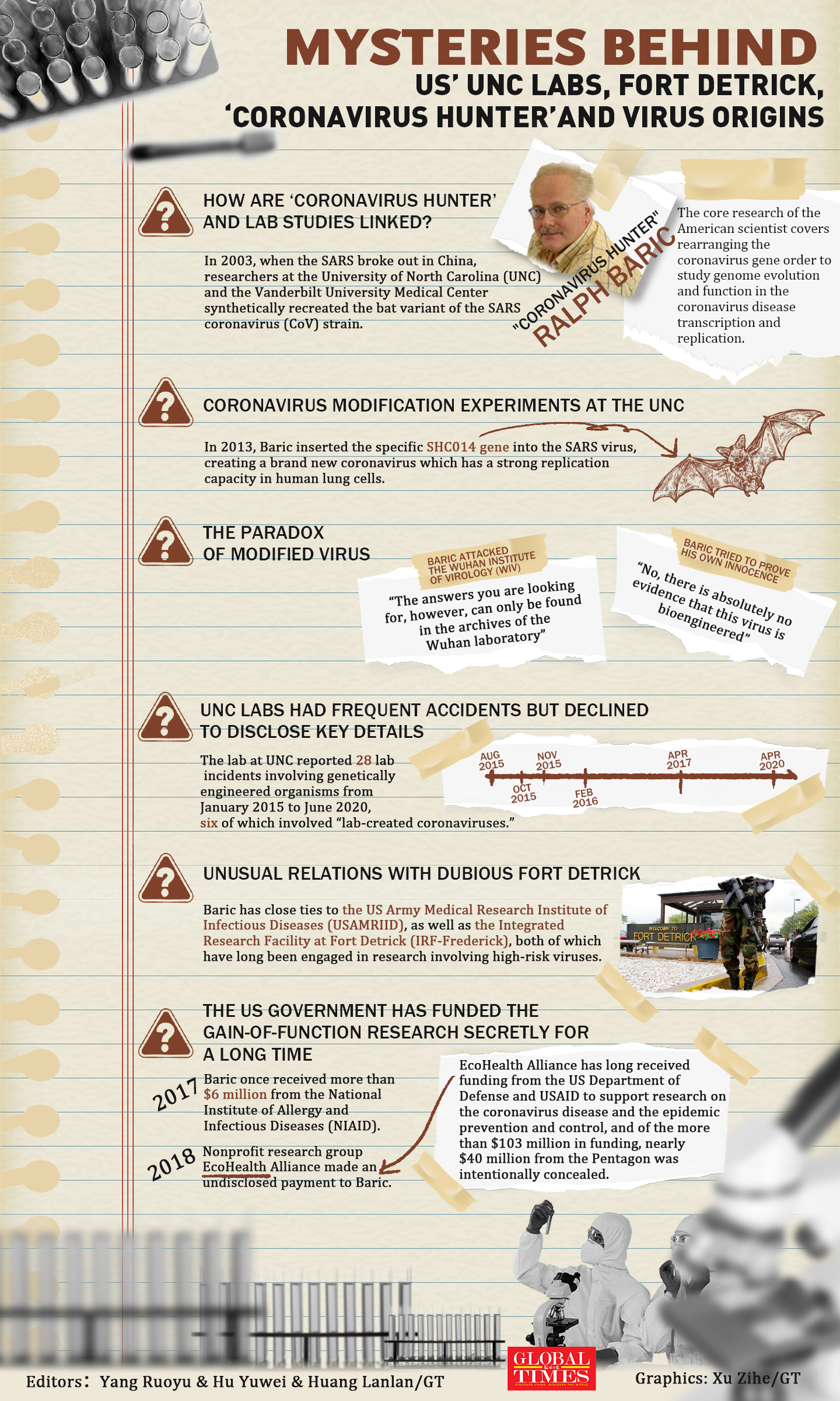 Mysteries behind US' UNC labs, Fort Detrick, 'Coronavirus Hunter' and virus origins. Graphic: Xu Zihe/GT