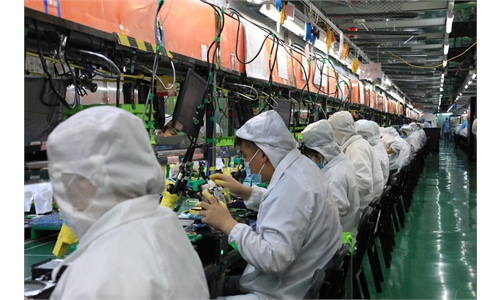 Workers at a production workshop of Foxconn's technology park in Zhengzhou, Central China's Henan Province on July 24, 2021. The park is a major global smartphone manufacturing base. Photo: VCG