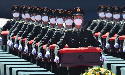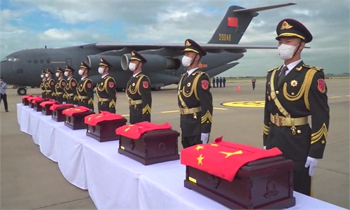 The remains of 109 Chinese People's Volunteers soldiers arrive at the Shenyang Taoxian International Airport in Northeast China's Liaoning on Thursday. Photo: cnsphoto