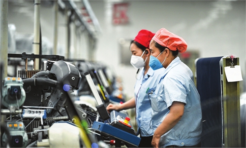 A worker is busy on the production line of a textile facility in Ruichang, East China's Jiangxi Province, on Thursday. The facility's products are mainly exported to Europe, Southeast Asia and South Africa. Photo: cnsphoto