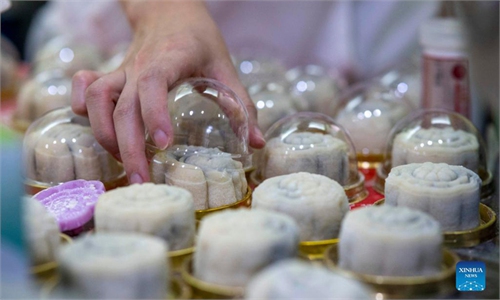 Workers at a plant in a village in Shijiazhuang, North China's Hebei Province make handmade mooncakes for the upcoming Mid-Autumn Festival this year. The village has over 40 mooncake companies employing over 2,000 people. China's mooncake market is expected to hit 21.8 billion yuan ($3.38 billion) in 2021, according to a report by iiMedia in August. Photo: VCG