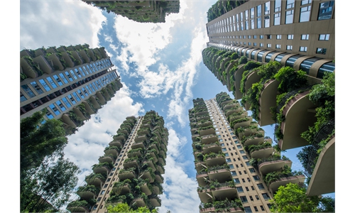 Various types of plants grow on the balconies of a 30-story residential building in Chengdu, Southwest China's Sichuan Province, giving the impression of a "vertical forest." Photo: IC