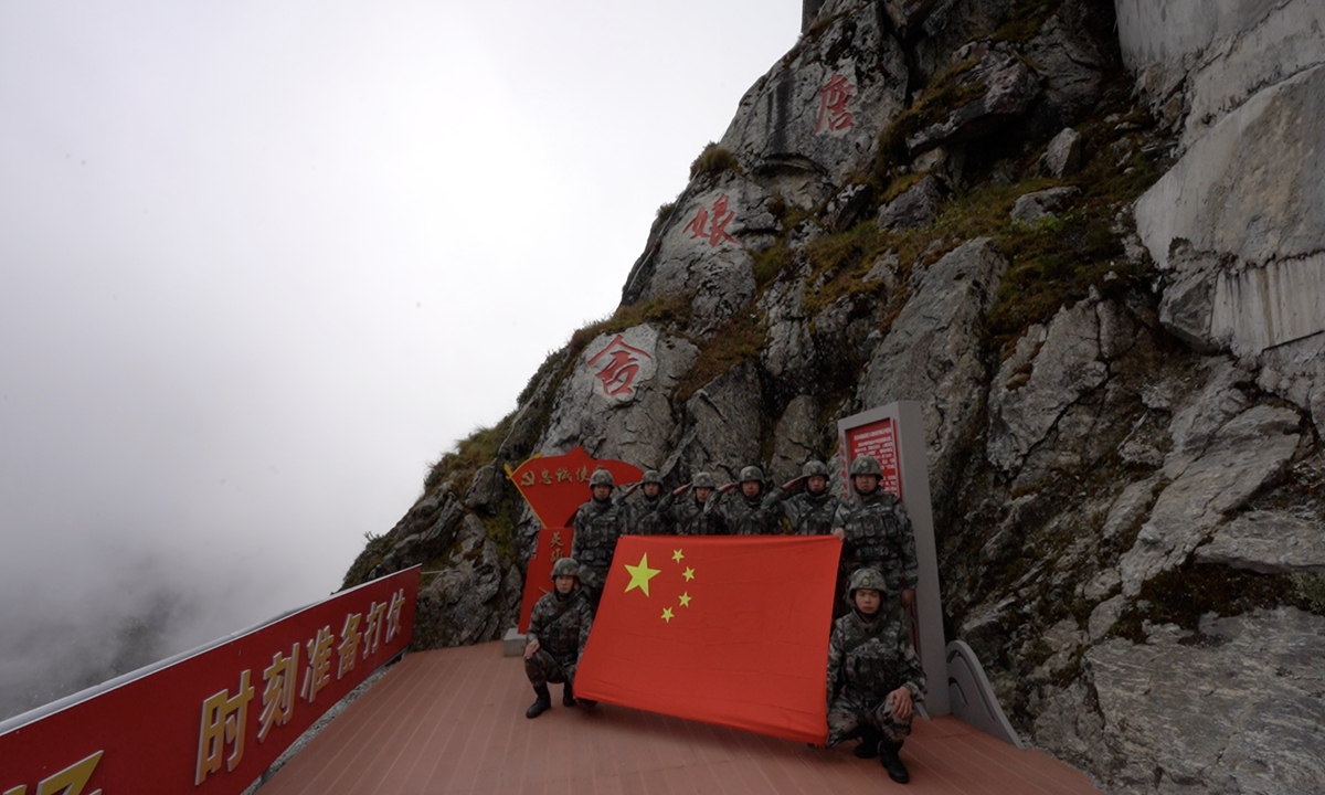 Soldiers of the Zhanniangshe post hold a Chinese national flag. Photo: Li Jieyi/GT