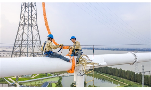 Photo taken on Nov. 20, 2020 shows technicians of State Grid Yanbian Power Supply Company repairing power supply lines in Dunhua of Yanbian Korean Autonomous Prefecture, northeast China's Jilin Province. Power supply has been affected due to extreme weather in Yanbian Korean Autonomous Prefecture recently. After thousands of technicians expedited maintaining the high-voltage wires, the power supply has been restored for over 160,000 households as of 11:00 a.m. on Nov. 22. Photo: Xinhua