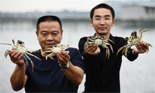 Deliverymen and a crab farmer package crabs in Huzhou, East China's Zhejiang Province, ahead of the National Day holidays. The mobile refrigerators visit rural areas to speed up delivery times and support China's robust e-commerce business in the crab season. Photo: cnsphoto