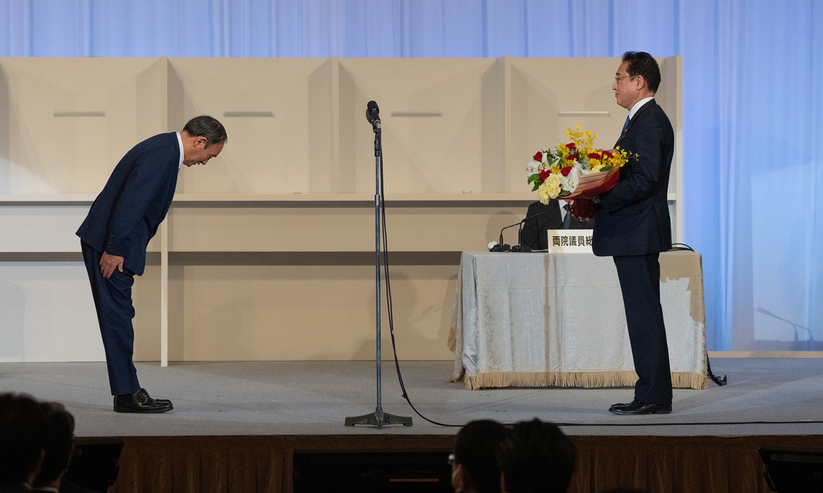 Outgoing Japanese Prime Minister Yoshihide Suga (left) bows to former foreign minister Fumio Kishida after the latter was elected the new leader of the ruling Liberal Democrat Party on Wednesday in Tokyo. Photo: VCG