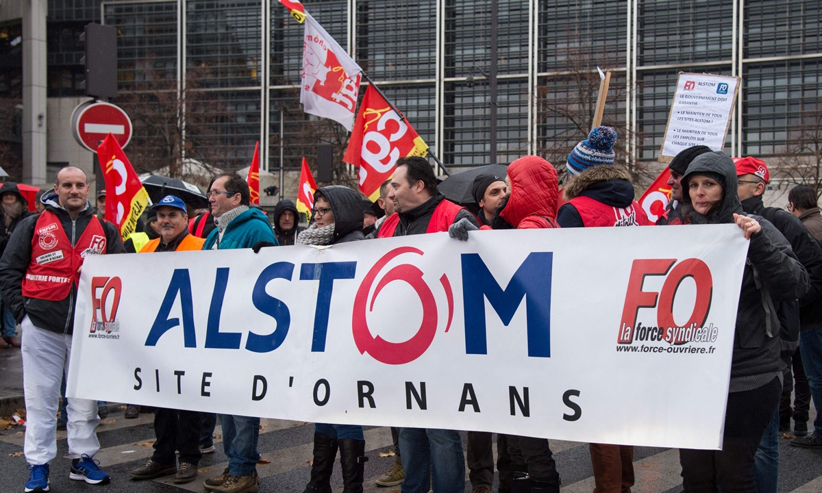 Alstom employees protest in front of the Economy Ministry in Paris, to call for measures to preserve jobs in France on November 30, 2017. Photo: VCG