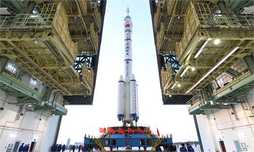 The combination of Shenzhou-13 manned spacecraft and Long March-2F Y13 carrier rocket rolled out to launch pad in Jiuquan Satellite Launch Center in Northwest China's Gansu Province on Thursday. The upcoming mission is expected to send three taikonauts to China's Tianhe space station core module for record-long six-month stay in orbit. Photo: Wang Jiangbo