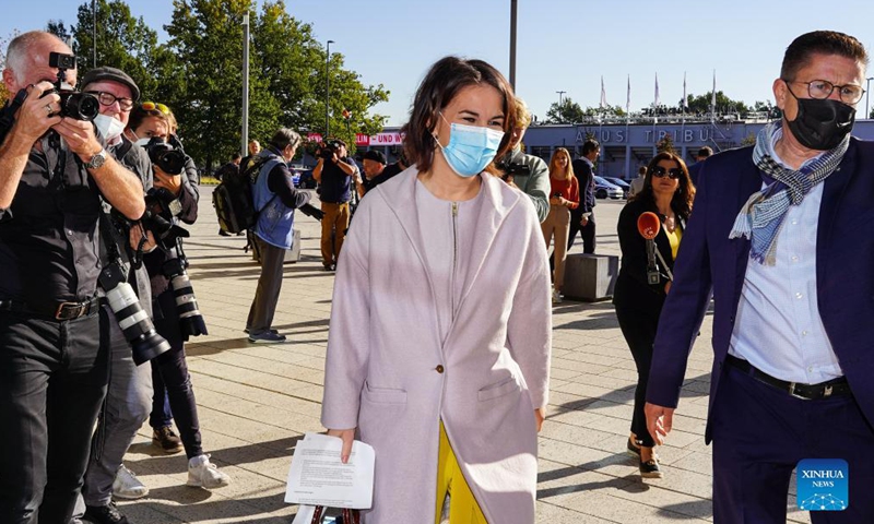 Germany's Green Party co-leader Annalena Baerbock (C) arrives for negotiations in Berlin, capital of Germany, on Oct. 7, 2021. A week and a half after the federal election, the Free Democratic Party (FDP) and the Green Party started negotiations with the Social Democratic Party (SPD) to build a so-called traffic light coalition on Thursday.Photo:Xinhua
