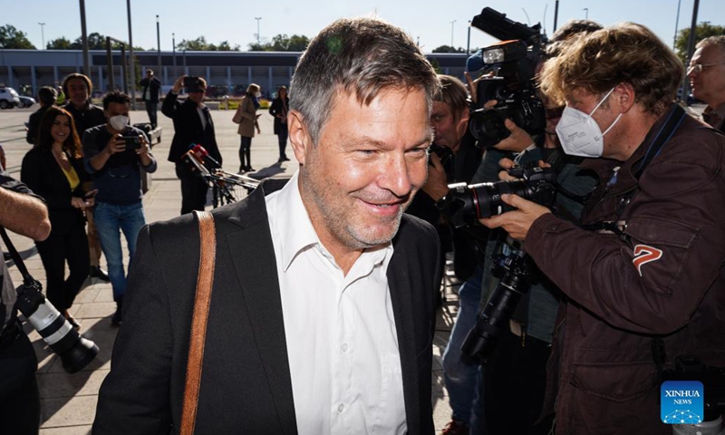 Germany's Green Party co-leader Robert Habeck (C) arrives for negotiations in Berlin, capital of Germany, on Oct. 7, 2021. A week and a half after the federal election, the Free Democratic Party (FDP) and the Green Party started negotiations with the Social Democratic Party (SPD) to build a so-called traffic light coalition on Thursday.Photo:Xinhua