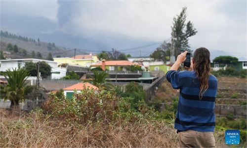 Photo taken on Sept. 24, 2021 shows the scene of volcanic eruption of Cumbre Vieja volcano in La Palma, Spain. (Photo: Xinhua)