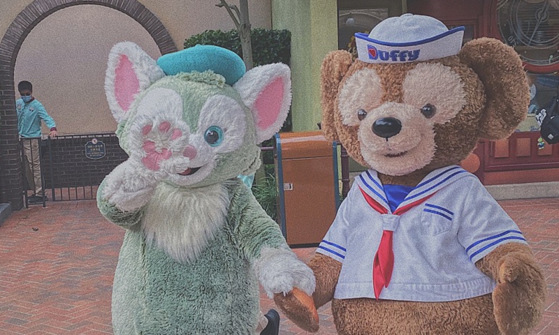 Employees dressed in costomes of the artistic cat Gelatoni (left) and Duffy the Disney Bear at the Shanghai Disney Theme Park File Photo: CFP