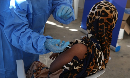 People wait to receive a vaccine developed by Chinese pharmaceutical company CanSino against COVID-19 at a mobile vaccination site, in La Carcova neighborhood of Jose Leon Suarez, Argentina, on Oct.1, 2021.(Photo: Xinhua)