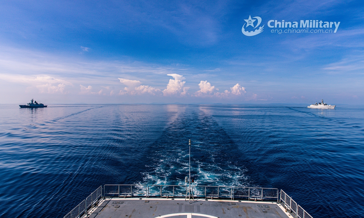 The guided-missile destroyers Hohhot (Hull 161) and Wuhan (Hull 169), together with the guided-missile frigate Hengyang (Hull 568), steam in formation in an undisclosed sea area during a 4-day maritime real-combat training exercise on September 2, 2020. All the warships are attached to a naval destroyer flotilla under the PLA Southern Theater Command. (eng.chinamil.com.cn/Photo by Li Wei)