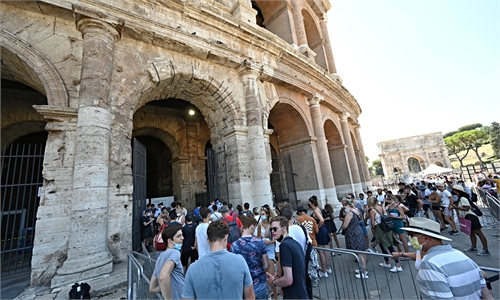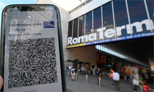 A passenger holds a cellphone displaying COVID Green Pass QR code in Rome, Italy, on July 20, 2021. The COVID Green Pass will be mandatory to enter restaurants, cafes and other eateries in Italy starting from Aug. 6, the government announced Thursday.Photo:Xinhua
