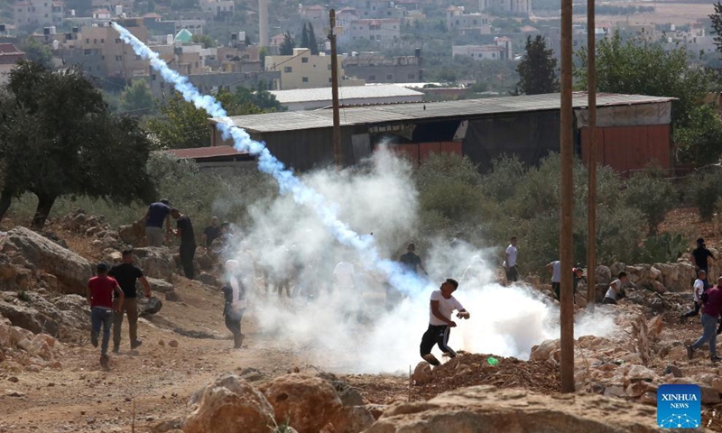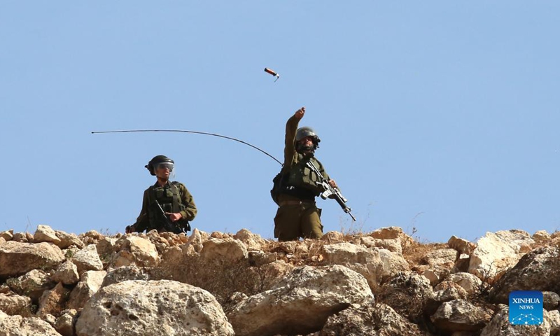 An Israeli soldier throws a tear gas canister at Palestinian protesters during a protest against the expansion of Jewish settlements in the West Bank village of Beit Dajan, east of Nablus, Oct. 15, 2021.Photo:Xinhua