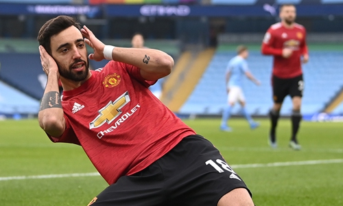 Manchester United's Cristiano Ronaldo (No.7) celebrates scoring with teammate Harry Maguire on Wednesday in Manchester, England. Photo: VCG