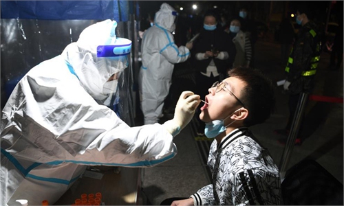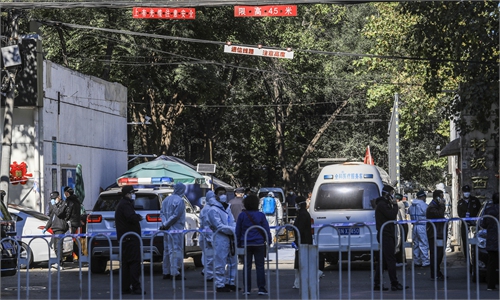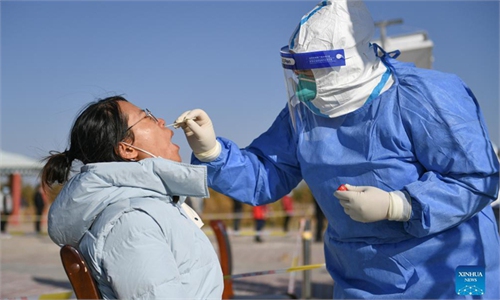 A medical worker disinfects facilities at a residential area in Ejina Banner of Alxa League, north China's Inner Mongolia Autonomous Region, Oct. 20, 2021.Photo: Xinhua