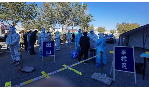 A medical worker takes a swab sample from a child for nucleic acid test at a residential area in Ejina Banner of Alxa League, north China's Inner Mongolia Autonomous Region, Oct. 20, 2021.Photo: Xinhua