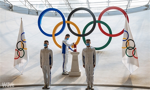 Visitors take pictures of the flame of the Beijing 2022 Winter Olympic Games displayed at the Olympic Tower near the "Bird's Nest" National Stadium in Beijing on October 23, 2021. The public will be able to book tickets to visit the flame, which landed in Beijing on October 20 from Athens, Greece. Photo: VCG