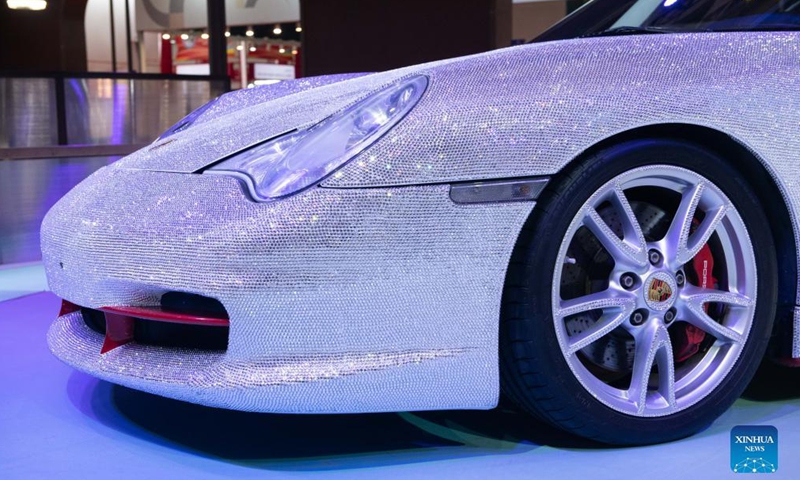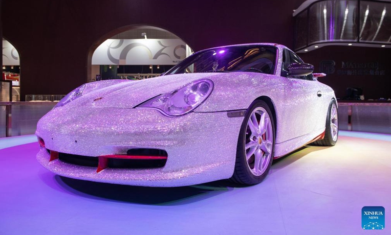 Photo taken on Nov. 5, 2021 shows a Porsche sports car decorated with gems at the Consumer Goods Exhibition Area of the 4th China International Import Expo (CIIE) in east China's Shanghai. The Porsche car is decorated with nearly 400,000 gems, which were made by craftsmen by hand for several months.Photo:Xinhua