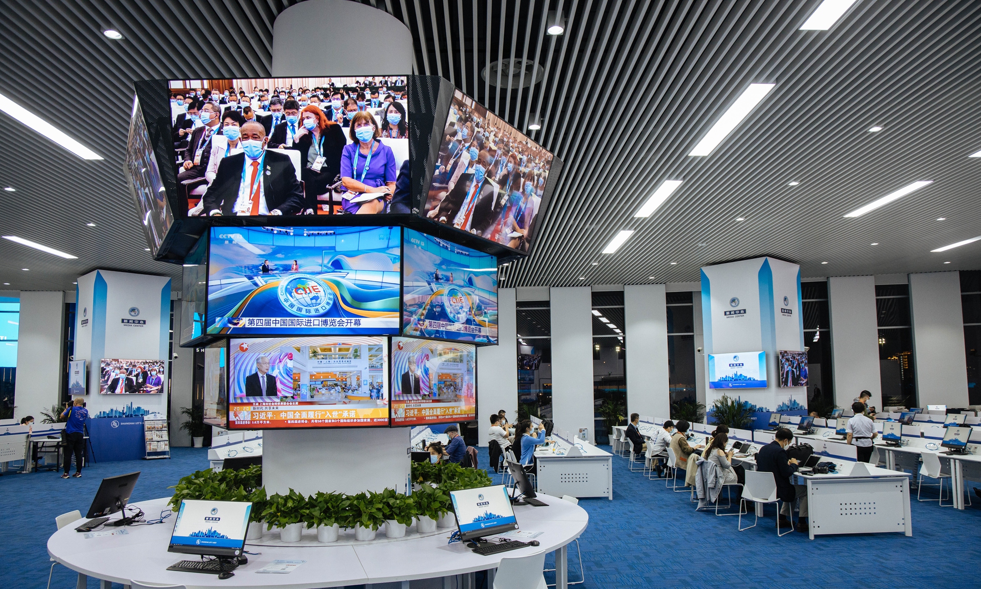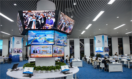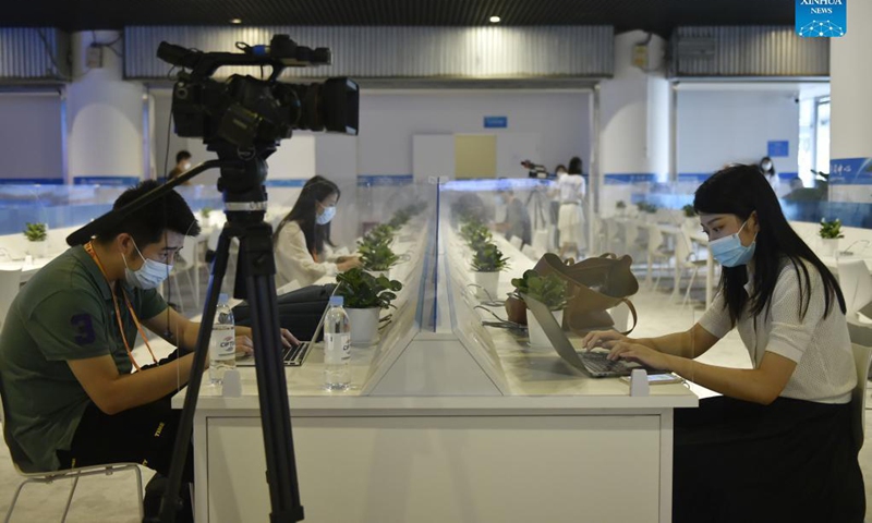 Journalists work at the media center of the China International Fair for Trade in Services (CIFTIS) at the China National Convention Center in Beijing, capital of China, Sept. 1, 2021. Photo: Xinhua