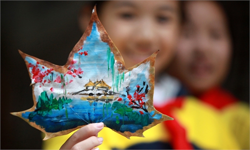 Primary school students in East China’s Jiangsu Province paint colorful drawings on tree leaves to preserve a unique ...