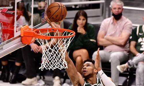Giannis Antetokounmpo (No.34) of the Milwaukee Bucks shoots the ball against the New York Knicks on Wednesday in New York City. Photo: VCG