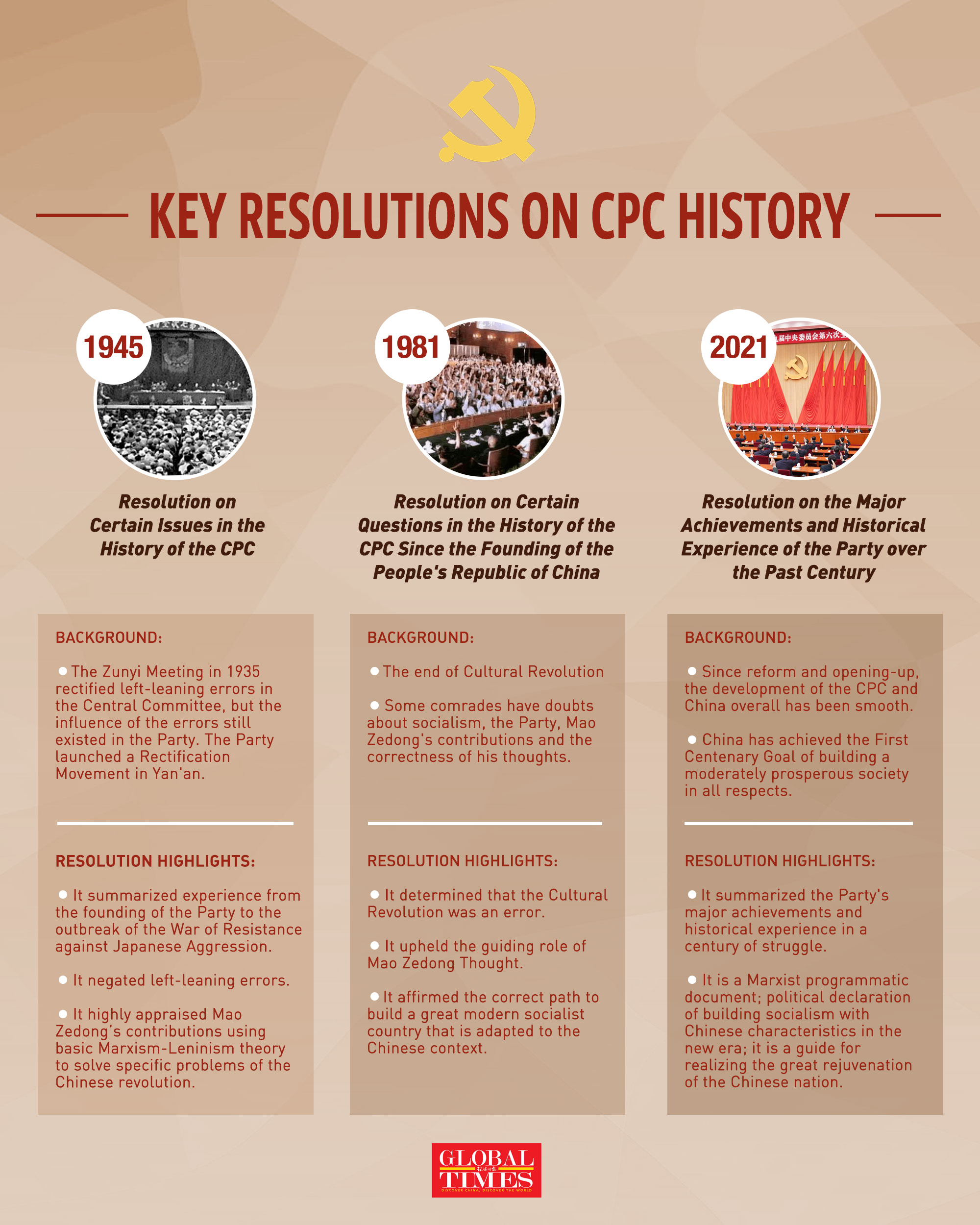 In the CPC’s history, two resolutions focused on studying historical questions like the Cultural Revolution. The 3rd landmark resolution, adopted at Sixth Plenary Session of the 19th CPC Central Committee, summarizes the Party's achievements and experience over the past century. Graphic: GT