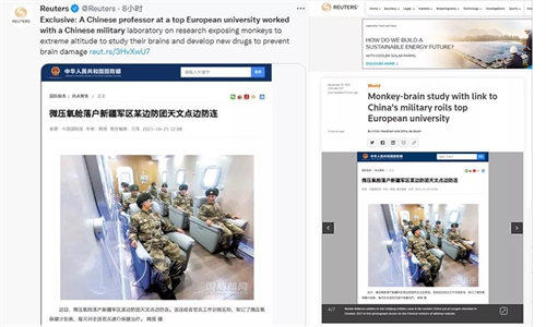 tweeted its article about Chinese military laboratory on research exposing monkeys to extreme altitudes alongside a photo of Chinese PLA soldiers in an oxygen chamber which had nothing to do with the content of the tweet.