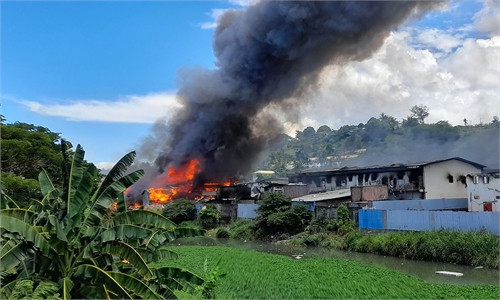 This handout image taken and received on November 25, 2021 from ZFM Radio shows parts of the Chinatown district on fire in Honiara on Solomon Islands, as rioters torched buildings in the capital in a second day of anti-government protests. Photo: VCG