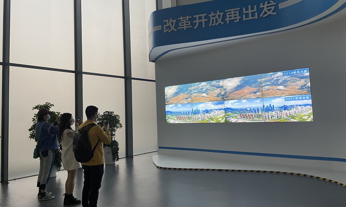 Visitors stand in front of a large screen which shows the changes of the Qianhai Shenzhen-Hong Kong Modern Service Industry Cooperation Zone in Shenzhen before 2010 and in 2021, on November 28, 2021. Photo: Liu Caiyu/Global Times
