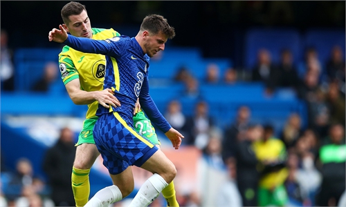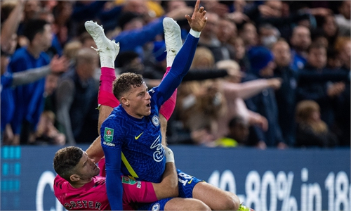 Fred (center) of Manchester United and Trevoh Chalobah of Chelsea go down during their match at Stamford Bridge on November 28, 2021 in London, England. Photo: VCG