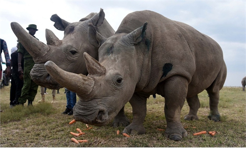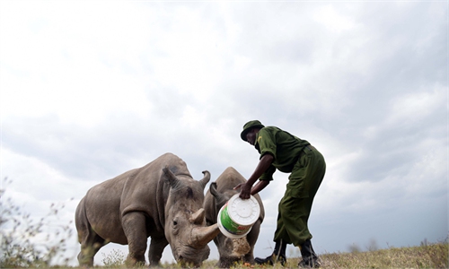 File photo shows guards stand near the female northern white rhino called Najin inside an open enclosure at Ol Pejeta Conservancy in Nanyuki, Kenya, April 17, 2015.(Photo: Xinhua)