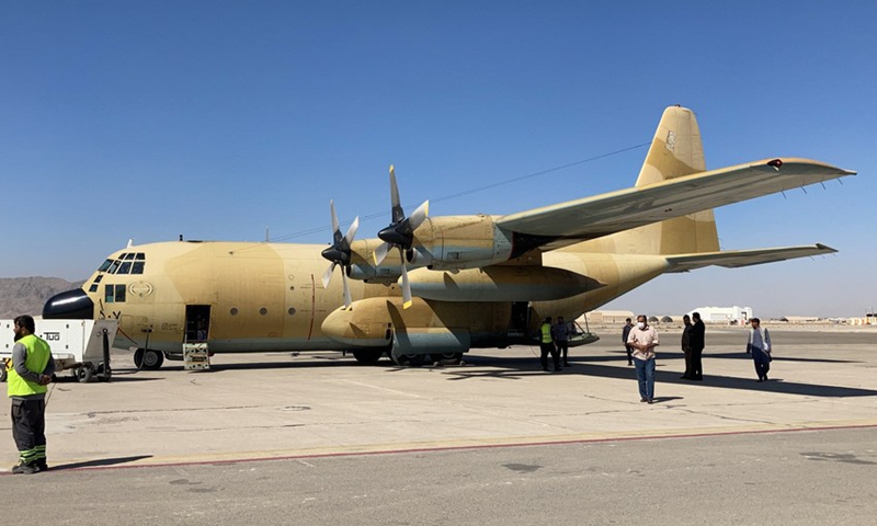 An airplane is about to unload humanitarian aid for victims of terrorist attacks, in Kandahar city, southern Afghanistan, Oct. 18, 2021.(Photo: Xinhua)