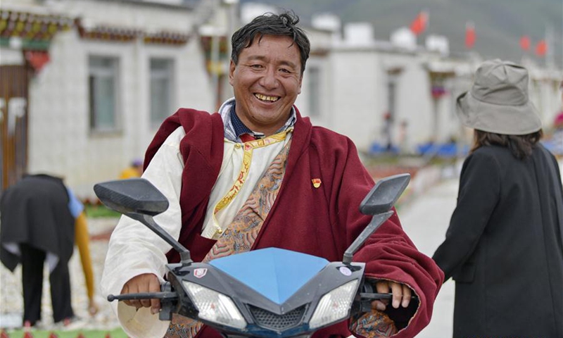 A villager rides an electric motor in the Caiqutang relocation village in Yangbajain Township, Damxung County, southwest China's Tibet Autonomous Region, Aug. 2, 2020. Relocation for poverty-relief purposes carried out in recent years has helped boost rural revitalization in Tibet Autonomous Region. For instance, the Caiqutang relocation village, which saw its first resettlers in late 2017, now offers better utilities and health care to 683 inhabitants who moved from less amiable alpine areas. The relocated residents are also allotted dividends from Yangbajain's hot-spring tourism revenue. Some have joined agricultural collectives which provide job opportunities with decent income. Photo:Xinhua